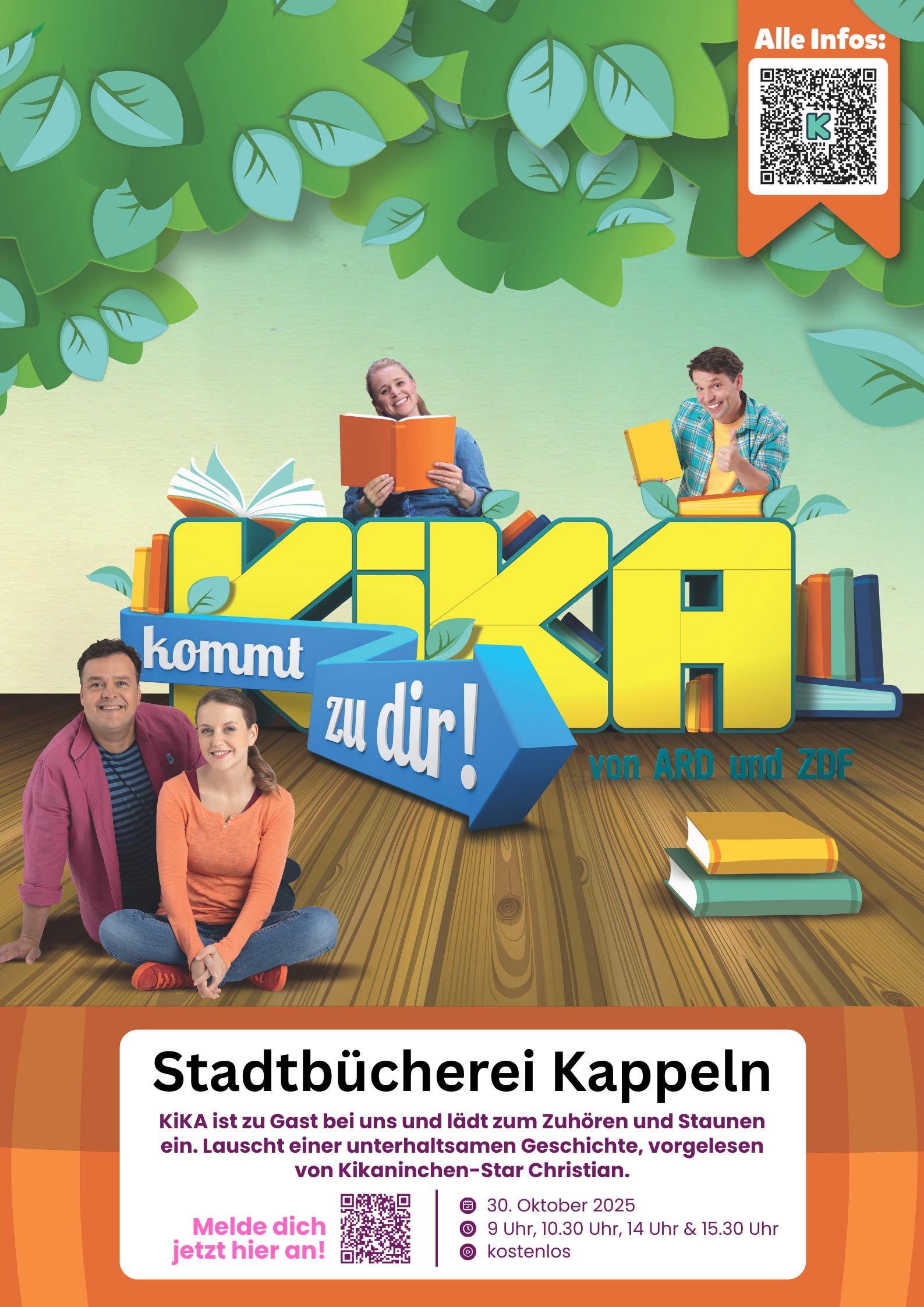 KiKA ist zu Gast in der Stadtbücherei Kappeln und lädt zum Zuhören und Staunen ein. Lauscht einer unterhaltsamen Geschichte, vorgelesen von Kikaninchen-Star Christian.